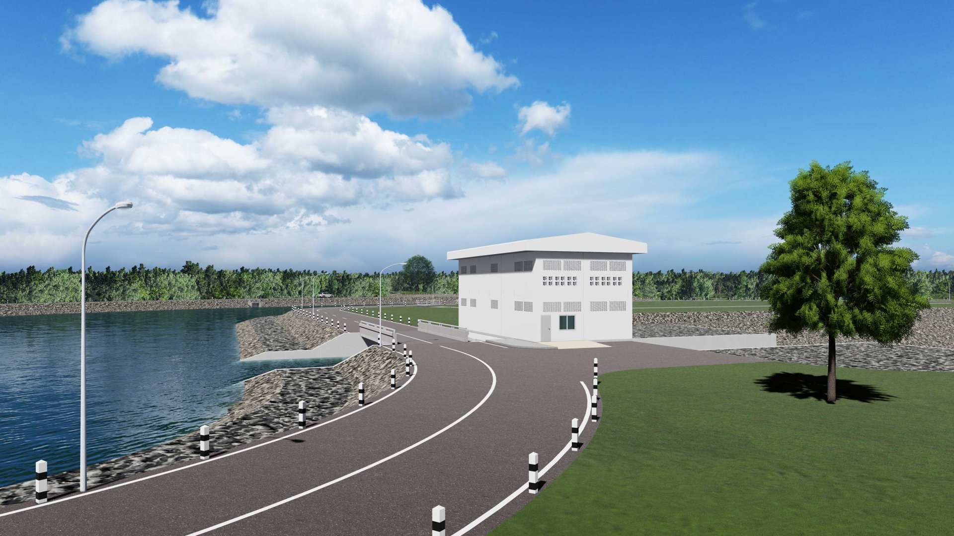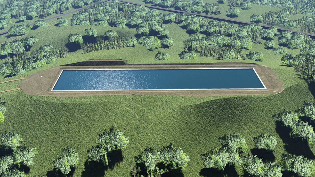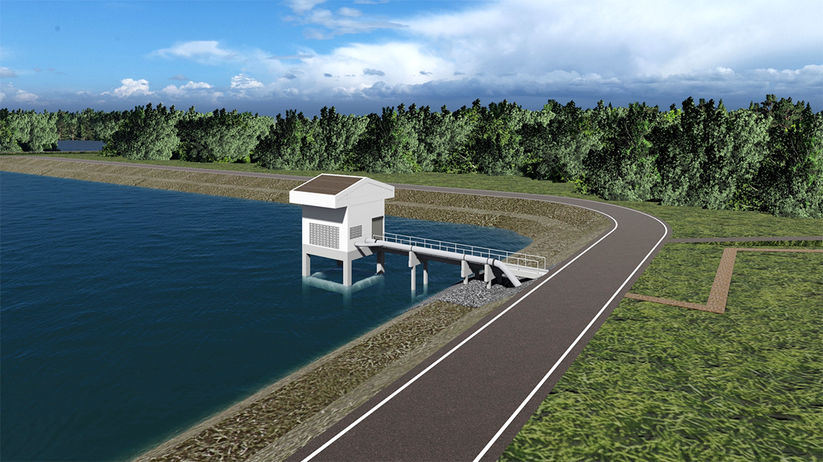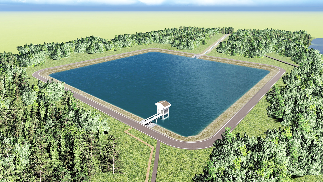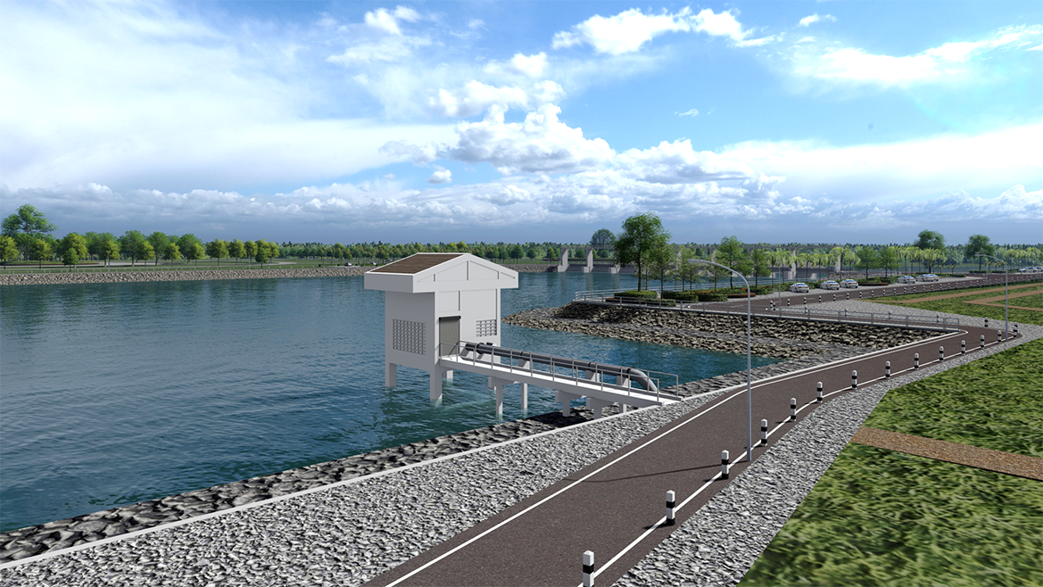ขนาดบ่อพักน้ำ 150 x 160 x 5 เมตร ความจุ 120,000 ลบ.ม/วินาที